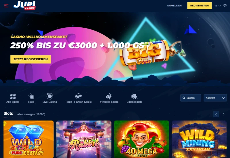 Wir haben unser Casino darauf ausgerichtet, aufregendes und verlässliches Online-Spiel zu bieten. Greifen Sie auf mehr als 11.000 Titel zu — von traditionellen Slots über moderne Crash-Spiele bis hin zu authentischen Live-Tischen — und entdecken Sie ständig Neues. Alle Spiele bei Casino Jupi Deutschland stammen von Top-Anbietern und funktionieren einwandfrei auf jedem Gerät, sodass Sie Desktop, Tablet oder Handy für Drehungen, Einsätze und Gewinne nutzen können.