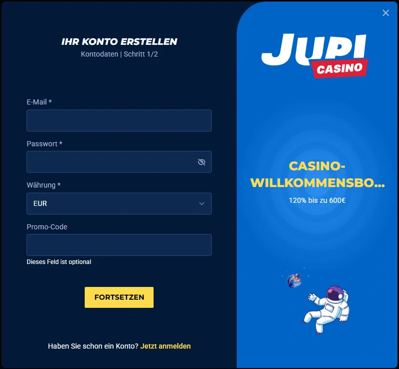 (Optional) Geben Sie vor der Einzahlung einen Jupi Bonuscode fĂĽr Willkommensvorteile ein.