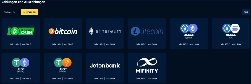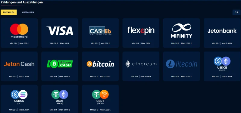 Deutsche Spieler können aus einer großen Auswahl an EUR- und Krypto-Optionen wählen – von klassischen Methoden wie Visa und Mastercard bis hin zu fortschrittlichen Wallets wie MiFinity und JetonBank sowie beliebten Kryptowährungen wie Bitcoin und Ethereum.