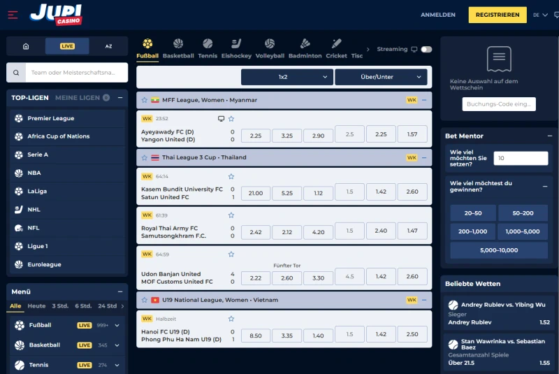Erweitern Sie Ihre Reise über die Jupi Casino Slots hinaus mit unserem Sportwettenbereich, der jede große Sportgalaxie abdeckt – von Fußball und Basketball bis Tennis, Eishockey und E-Sports.
